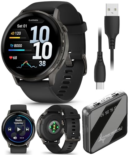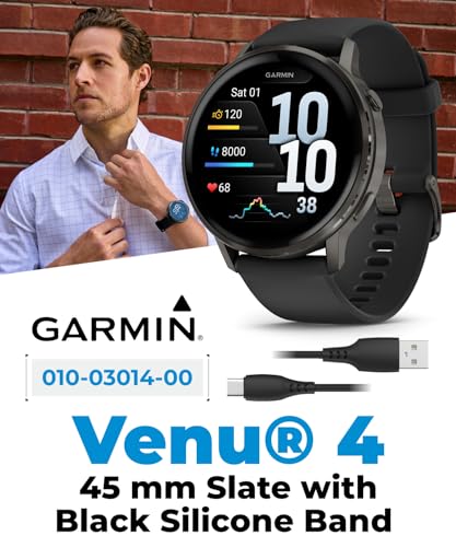 Specification: Garmin Venu 4 45mm AMOLED Advanced Health & Fitness GPS Smartwatch, Bright & Colorful Display, Built-in Flashlight, Up to 12 Days, Slate with Black Silicone Band w/Wearable4U PowerBank Bundle