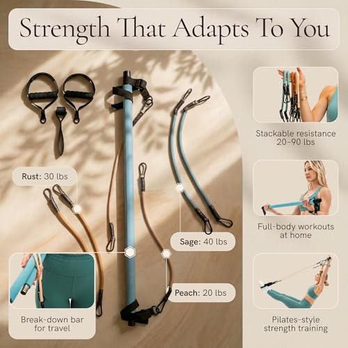 ☽ Resistance Bands with Bar: Includes a sturdy fusion Pilates bar with 3 pairs of interchangeable resistance bands to target arms, glutes & abs. Perfect exercise bar for home workouts that mimic studio reformer results.
