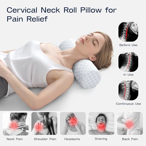 Specification: Neck Roll Pillow for Neck Pain Relief – Memory Foam Neck Support Pillow for Bed | Round Neck Pillow for Sleeping, 15.7 * 6 * 6 inch (Cool-Blue)