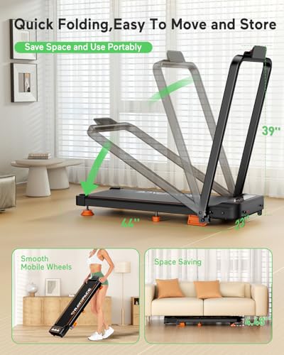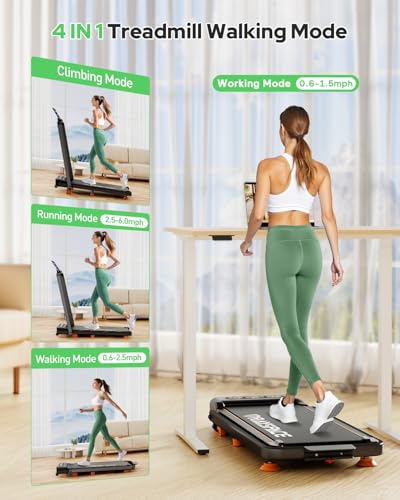 【4-In-1 Walking Pad Treadmill】Stay active all day with this 4-in-1 treadmill with incline, combining a walking pad, under desk treadmill, folding treadmill and hill climber into one. Use it under a desk when handle bar folded (0.6–2.5 MPH), raise the handle bar for jogging (2.5–4.0 MPH) or running (4.0–6.0 MPH). Perfect for all fitness levels, from beginners to those pushing your limits, it lets you stay active year-round, rain, snow, or cold, with no workout limits.